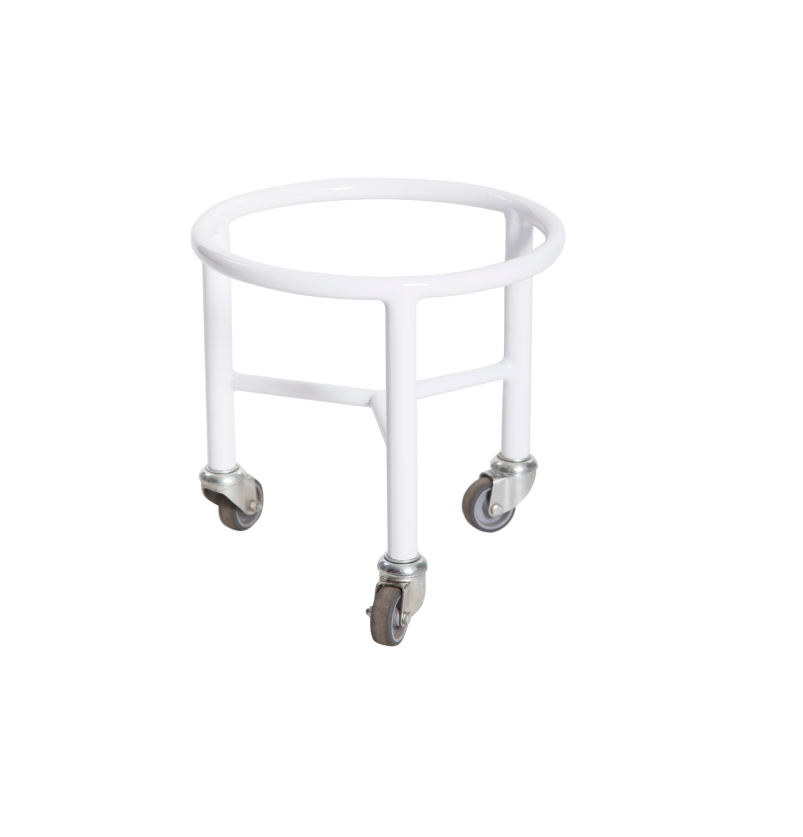Mobile kickabout for a bucket Bowl supported in a steel ring. Epoxy powder coated throughout. Mounted on 3 x 50mm swivel castors. Bucket excluded (Dimensions; height 205mm; overall diameter 357mm)