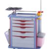 F45-3 Medicine Trolley / Crash Cart. Features: Constructed from ABS AND STEEL, Rail around 3 sides of the top of the trolley, 4 Full width lockable drawers with 40 partitions, Waste bin, Pull out writing shelf is provided, Storage for IV drugs on hook rod, Needle dispensing container, Swab container, Patient chart holder attached, Mounted on 4 X brake castors, SIZE L 850 X W 520 X H 1045mm, BOX SIZE 900 X 610 X 1130 MM 75KG.