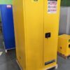 Designed to meet OSHA and NFPA 30 standards, flammable cabinet is constructed of sturdy 18-gauge (1-mm) thick double-wall, welded steel with 1-1/2-in (38-mm) of insulating air space for fire resistance. High-performance, self-latching doors close easily and securely for maximum protection under fire conditions. Fail-safe closing mechanism ensures three-point stainless steel bullet latching system works every time. For added security, Solid-K™ handle comes with a cylinder lock and key set or accepts an optional padlock. Ref-L™ reflective warning labels are highly visible under fire conditions or during power outages when illuminated with a flashlight. Galvanized steel shelves direct spills to back and bottom of a leakproof sump. They adjust on 2.36-in (60-mm) centers for versatile storage. Cabinets also feature a leakproof 2-in (51-mm) bottom sump, dual vents with flame arresters, four adjustable self-leveling feet, grounding connector and trilingual warning label. Durable lead-free epoxy/polyester powder-coat finish provides excellent chemical resistance.