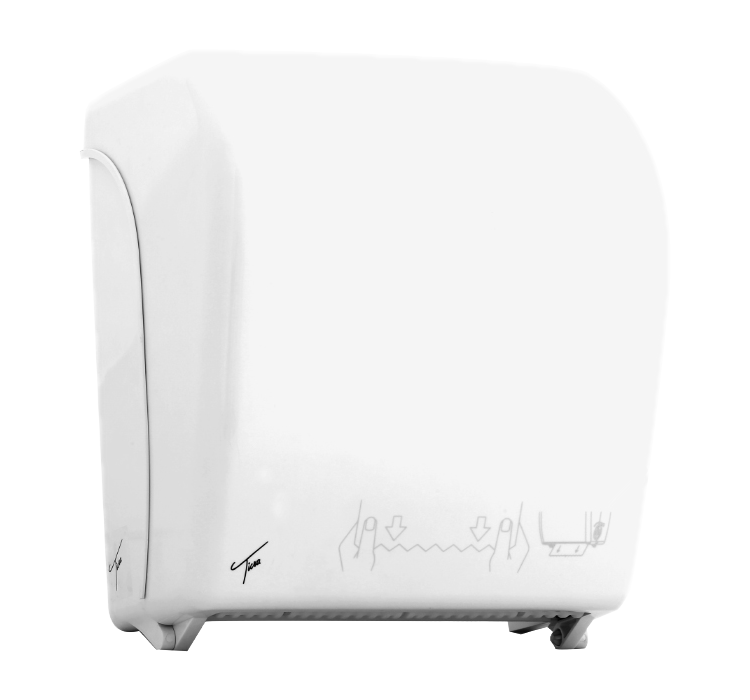 Touch-Free manually operated paper towel dispenser. Used to dispense hand paper, for the drying of hands after washing. Allows the user to be safe from germs after washing hands, without the hassle of replacing batteries.