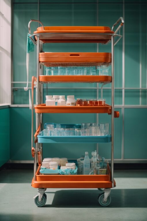 Room Service Trolley: Equipped with compartments for organizing individual meal orders and condiments for delivery directly to patients’ rooms.