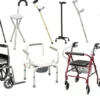 An aluminium. folding. four-wheel rollator. It has a padded seat and a removable vinyl storage bag located under the seat. Features include height adjustable contoured hand grips and cable hand brakes.