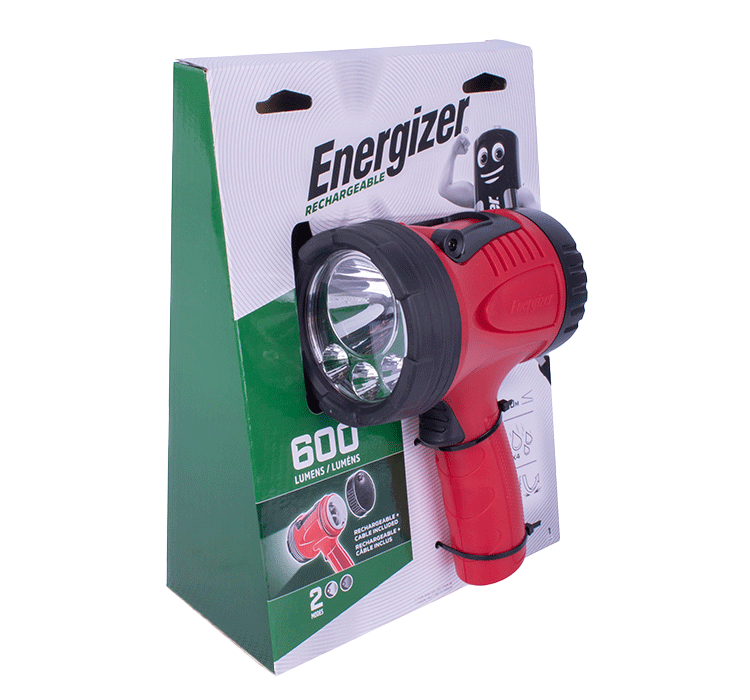 Energizer® Rechargeable Spotlight is a Rugged rechargeable spotlight in small form factor and appealing red colou that Features the latest LED technology. It is a great tool for professional work and DIY applications with a Compact and lightweight body, Great performance and brightness, with long beam distance. This Product has a large push button, making it easy to use even with gloves on. It is powered by a 2000mAh Lithium Ion non-removeable rechargeable battery.