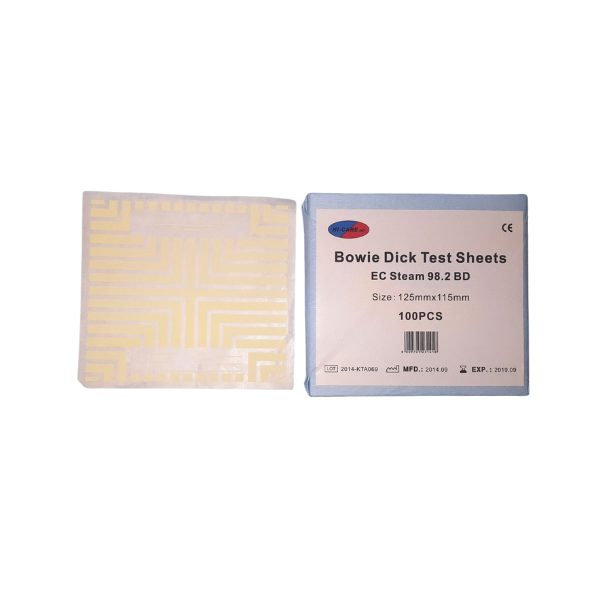 A Bowie-Dick test is used in pre-vacuum type (or dynamic air removal) sterilizers. They are used to detect air leaks and inadequate air removal and consist of folded 100% cotton surgical towels that are clean and preconditioned. A commercially available Bowie-Dick-type test sheet should be placed in the center of the pack. The test pack should be placed horizontally in the front, bottom section of the sterilizer rack, near the door and over the drain, in an otherwise empty chamber and run at 134°C for 3.5 minutes. The test is used each day the vacuum-type steam sterilizer is used, before the first processed load. Air that is not removed from the chamber will interfere with steam contact. Smaller, commercially available disposable test packs (or process challenge devices) have been devised to replace the stack of folded surgical towels for testing the efficacy of the vacuum system in a pre vacuum sterilizer. They should be representative of the load and simulate the greatest challenge to the load. Sterilizer vacuum performance is acceptable if the sheet inside the test pack shows a uniform color change. Entrapped air will cause a spot to appear on the test sheet, due to the inability of the steam to reach the chemical indicator. If the sterilizer fails the Bowie-Dick test, do not use the sterilizer until it is inspected by the sterilizer maintenance personnel and passes the Bowie-Dick test.